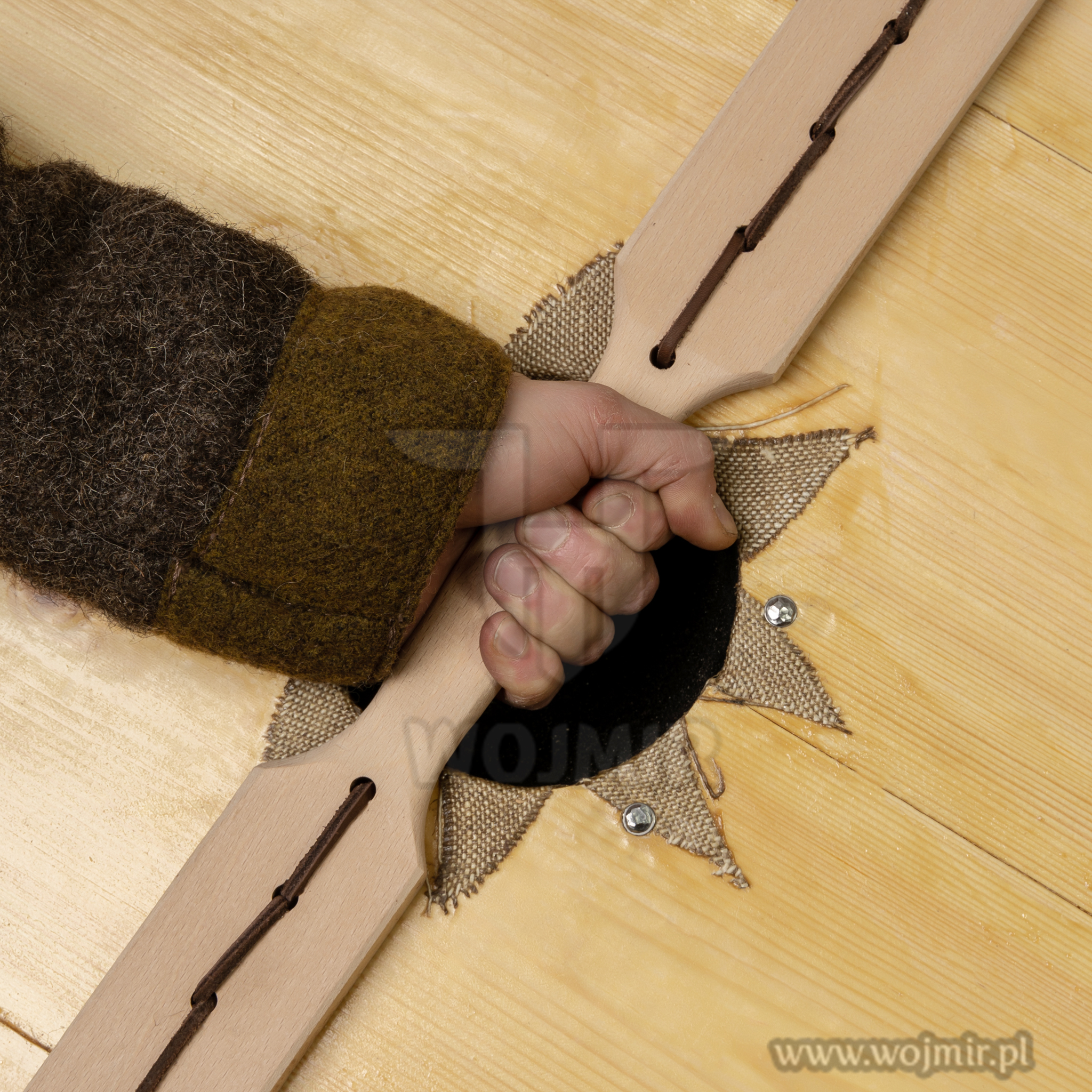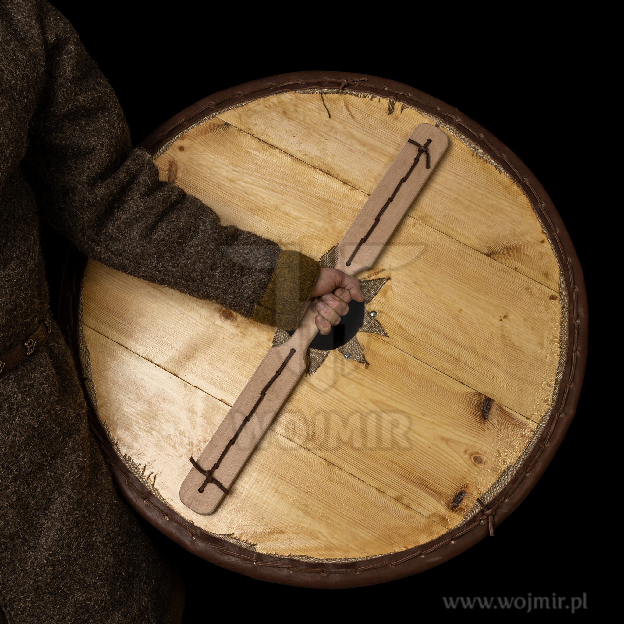 Viking shield with a diameter of 80 cm, stuck with bone glue, on both sides, with thick hemp canvas. 4.5mm leather reinforced rims. It has an umbo and a wooden handle. Possibility to make a shield of a different diameter – upon request by e-mail.