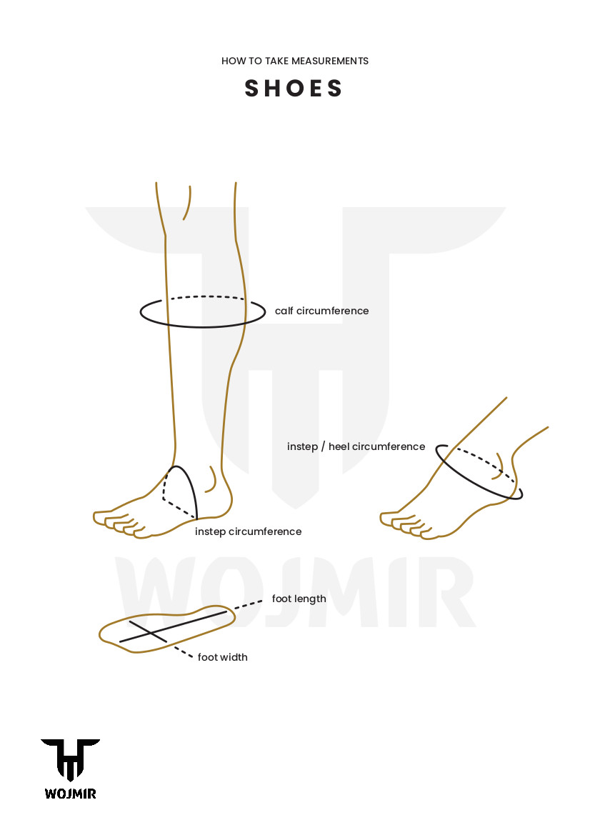 Wszystkie wymiary najlepiej pobierać na cienką skarpetę. Jeśli zamierzasz zakładać grubą wełnianą skarpetę, umieść taką informację w UWAGACH – ma to wpływ na rozmiar butów.