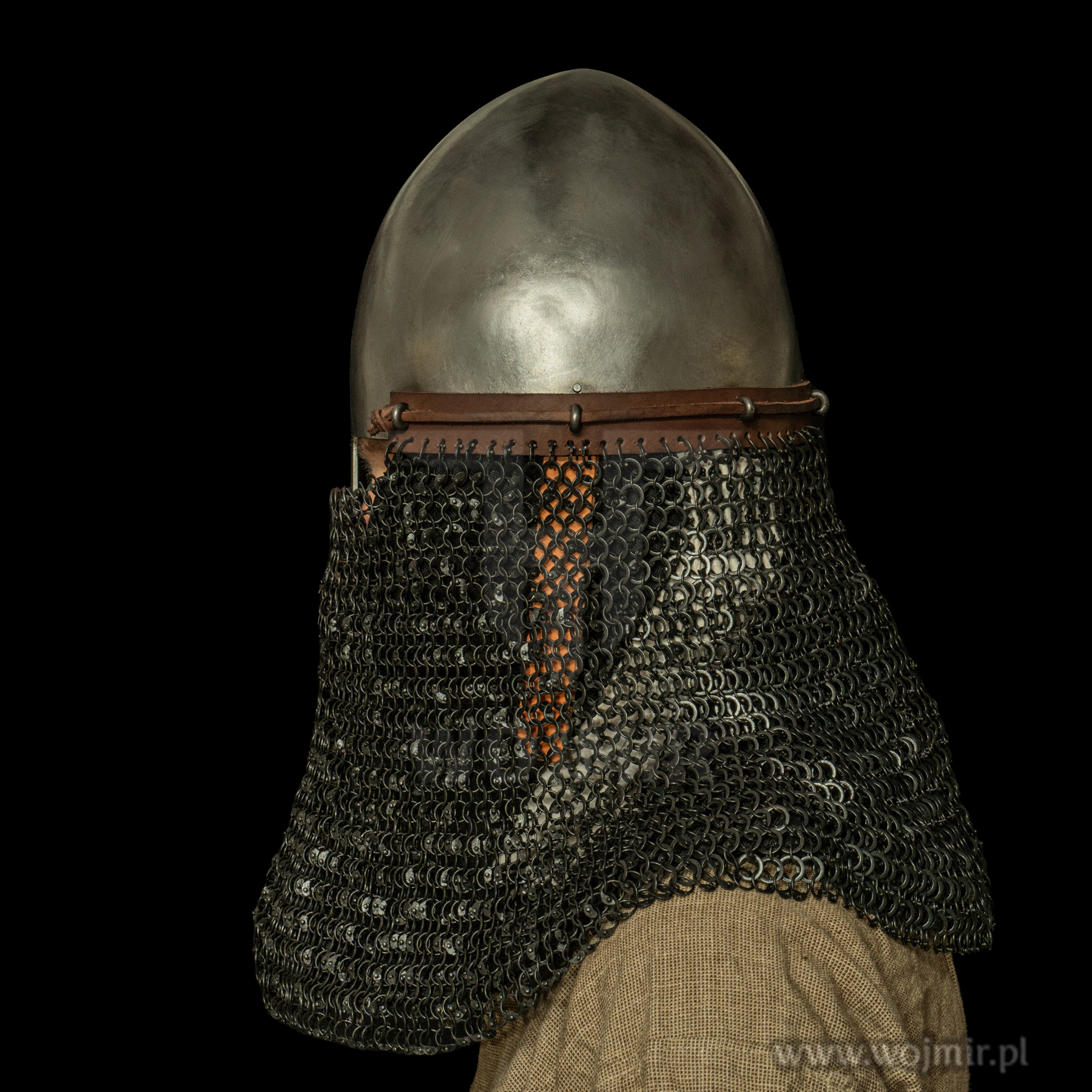 Hełm z jeziora lednickiego z hakami do zamocowania kolczugi (czepca, oplotu). Faktura blachy postarzana, idealnie oddaje klimat średniowiecza. Datowanie hełmu według znaleziska na 11w. Wykonany ze stali o grubości 2,5mm świetnie sprawdza się w PEŁNYM KONTAKCIE, HEMA, HUSCARL. Świetny do rekonstrukcji wczesnego średniowiecza.