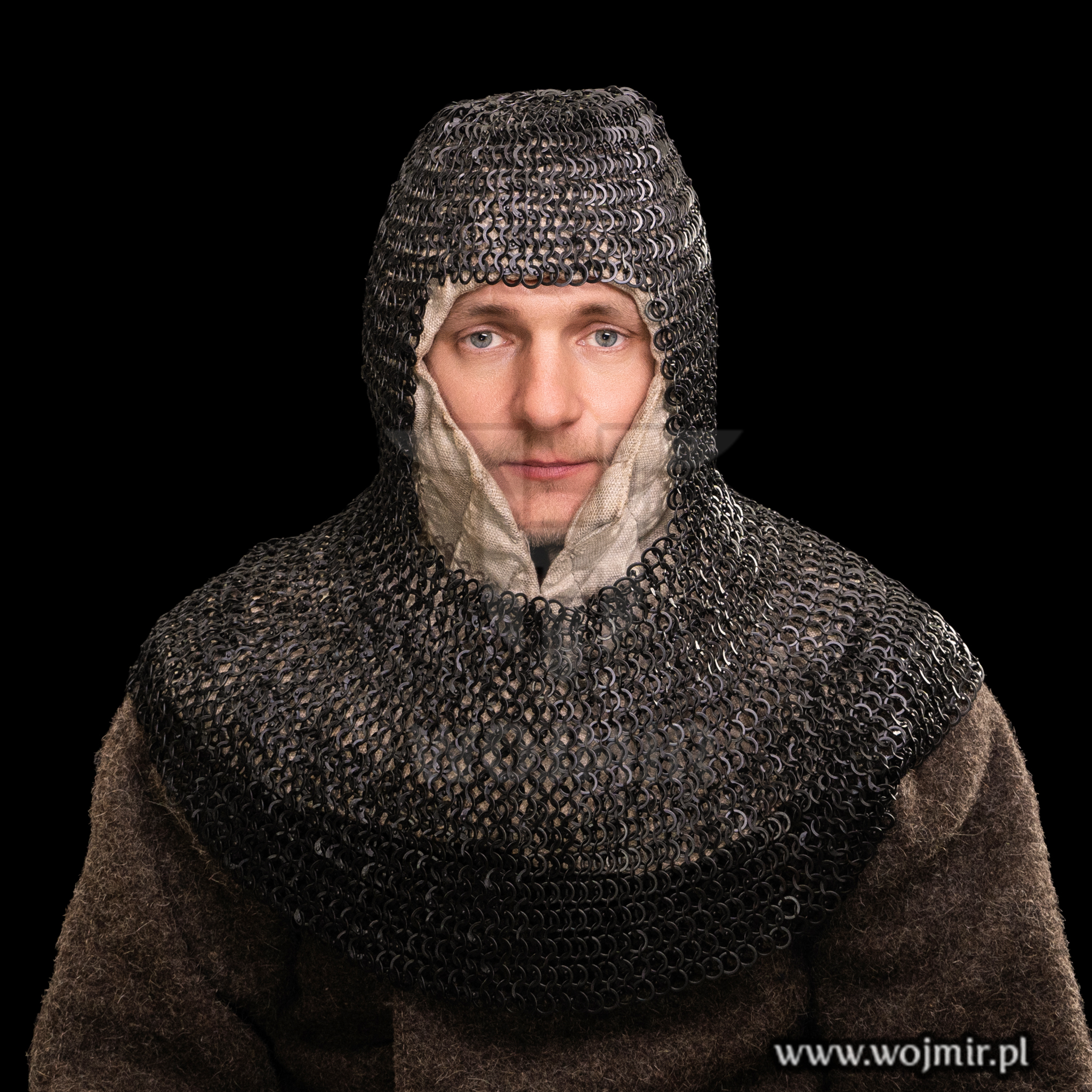 Kaptur kolczy wykonany z kółek 9mm płaskich na nit okrągły, nitowany naprzemiennie z kółkami sztancowanymi. Kaptur o obwodzie maksymalnym 70cm. Kaptur kolczy bardzo mocno się rozszerza i dopasowuje.