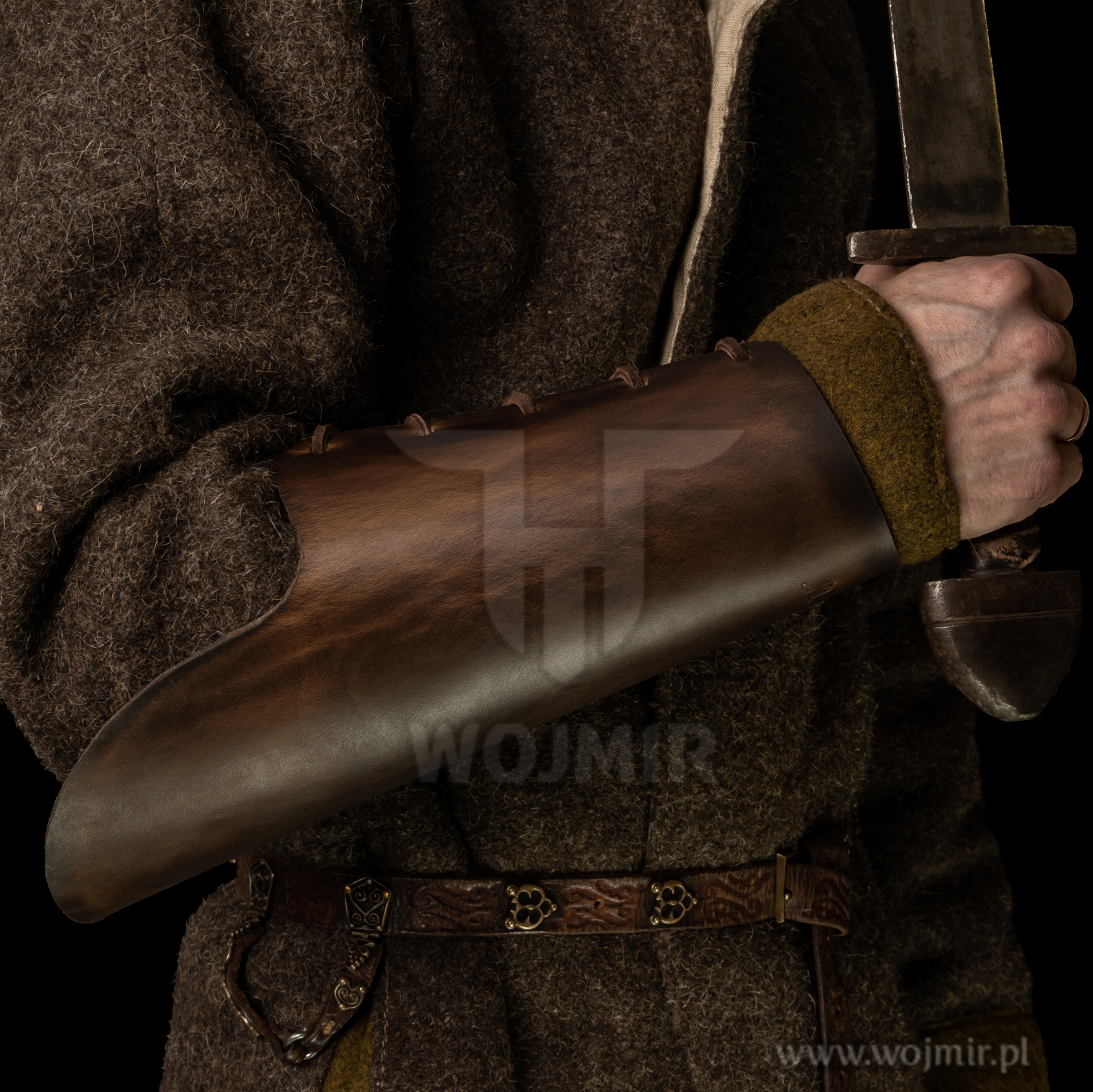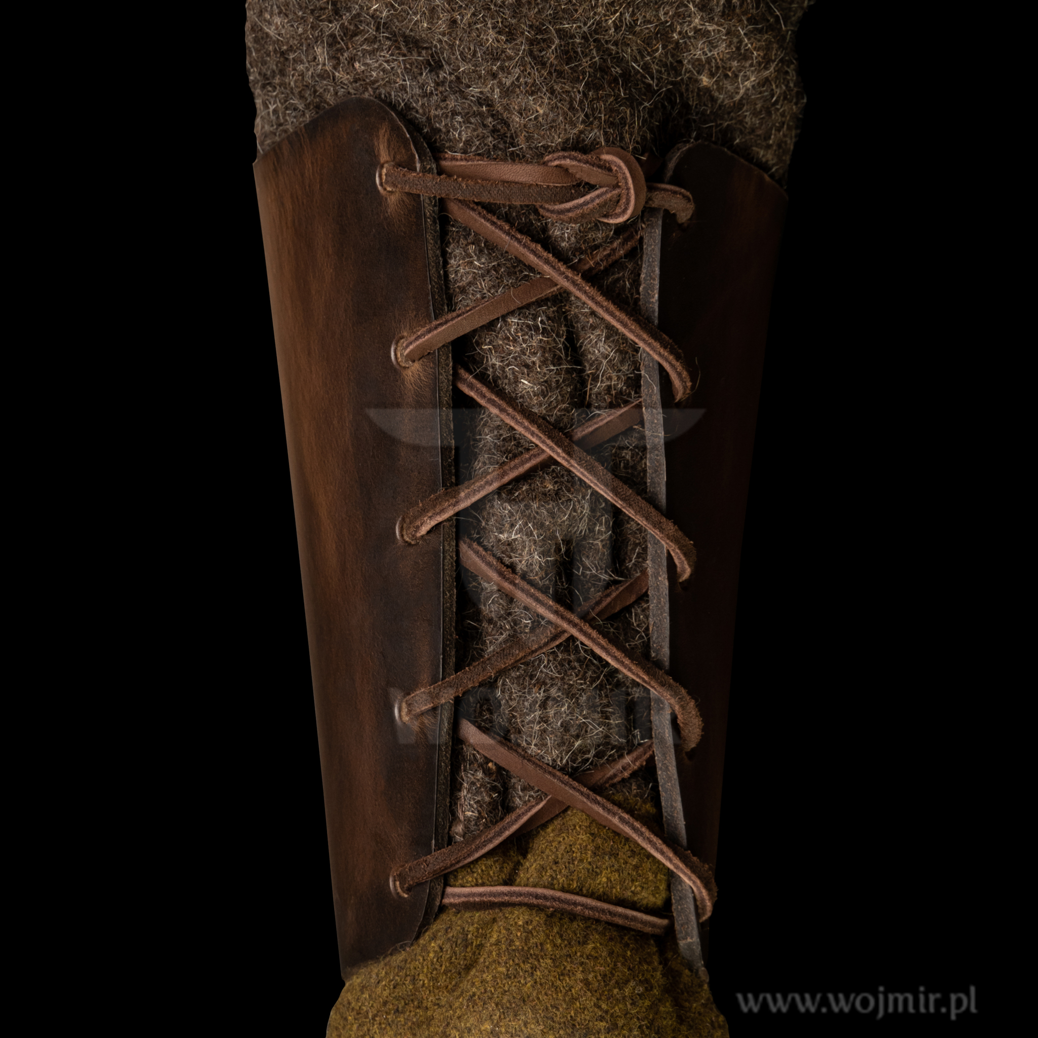 Karwasze ze skory o grubości 4,5mm utwardzane w naturalnym wosku pszczelim, wiązane na rzemień.