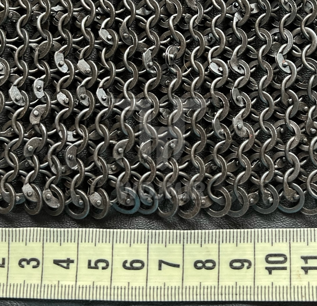 Kolczuga 6mm nitowana, krótki rękaw do połowy uda. Wykonana z kółek o przekroju okrągłym o średnicy 6mm, nit okrągły, nitowana naprzemiennie z kółkami sztancowanymi.