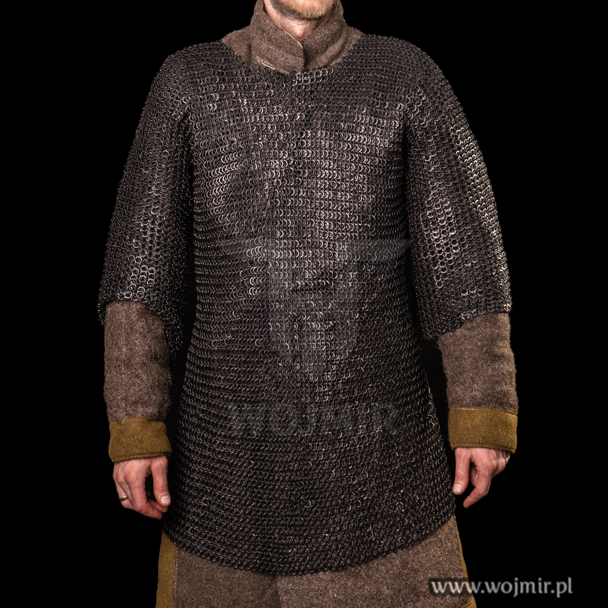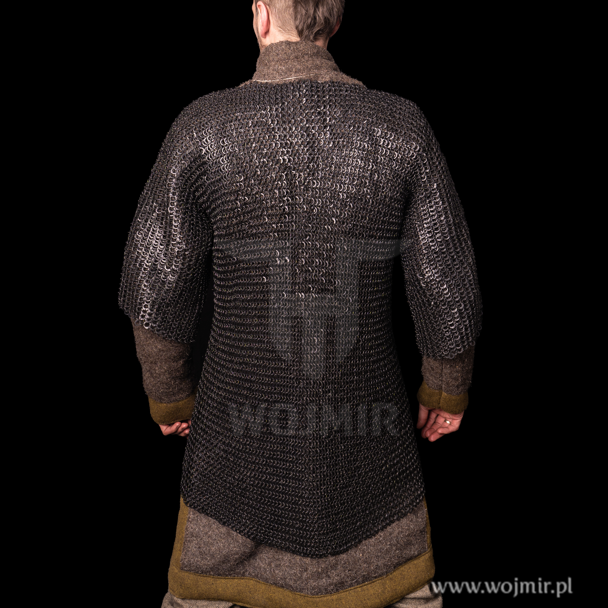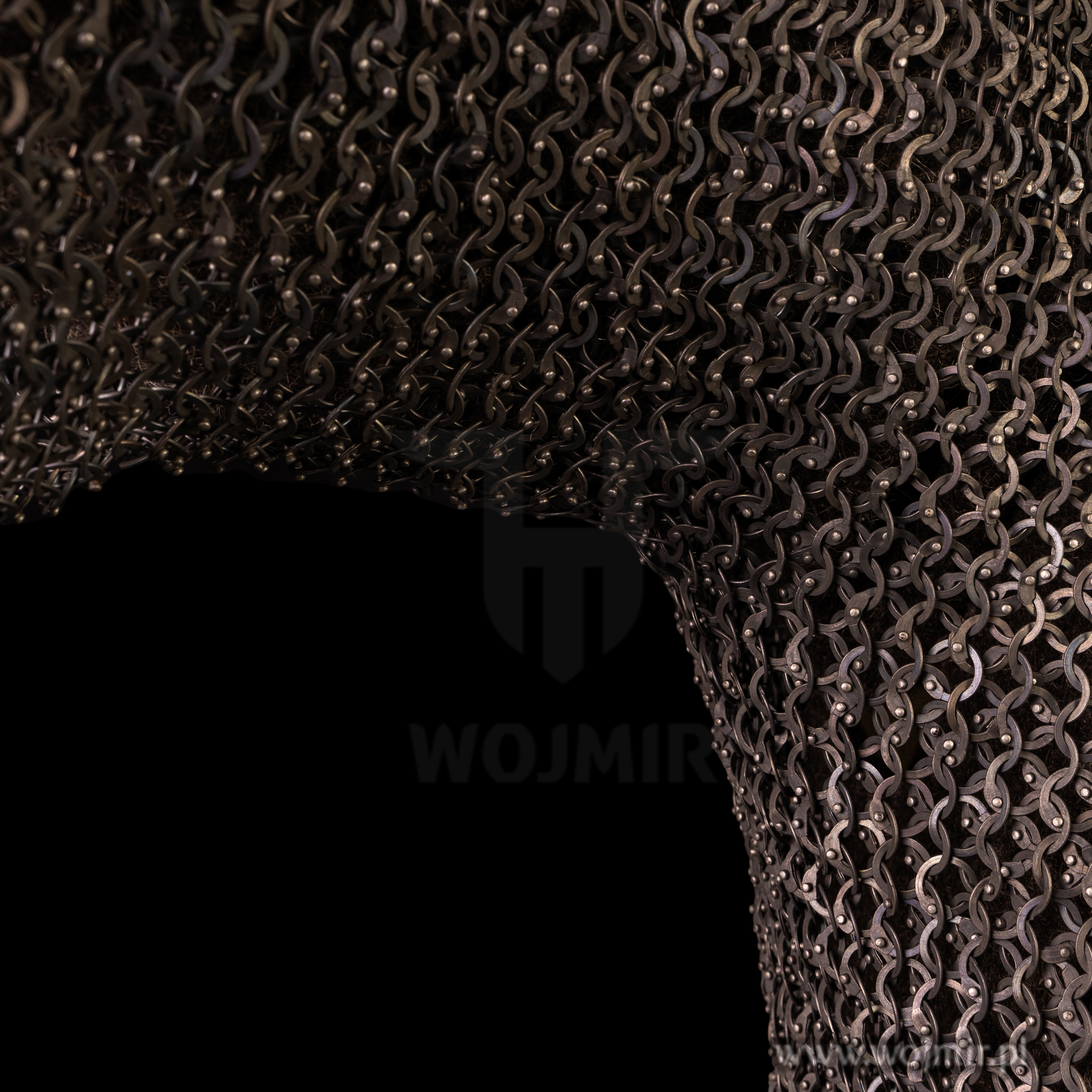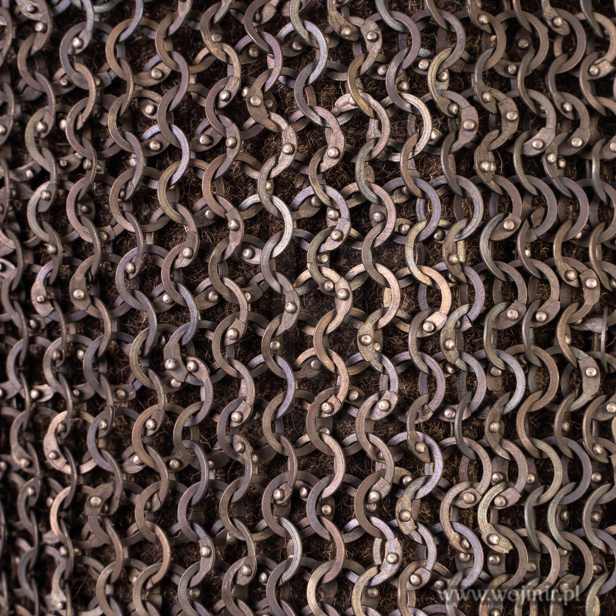 Kolczuga TYTANOWA nitowana, krótki rękaw do połowy uda. Wykonana z kółek płaskich o średnicy 9mm, nit okrągły, naprzemienna z kółkami sztancowanymi.