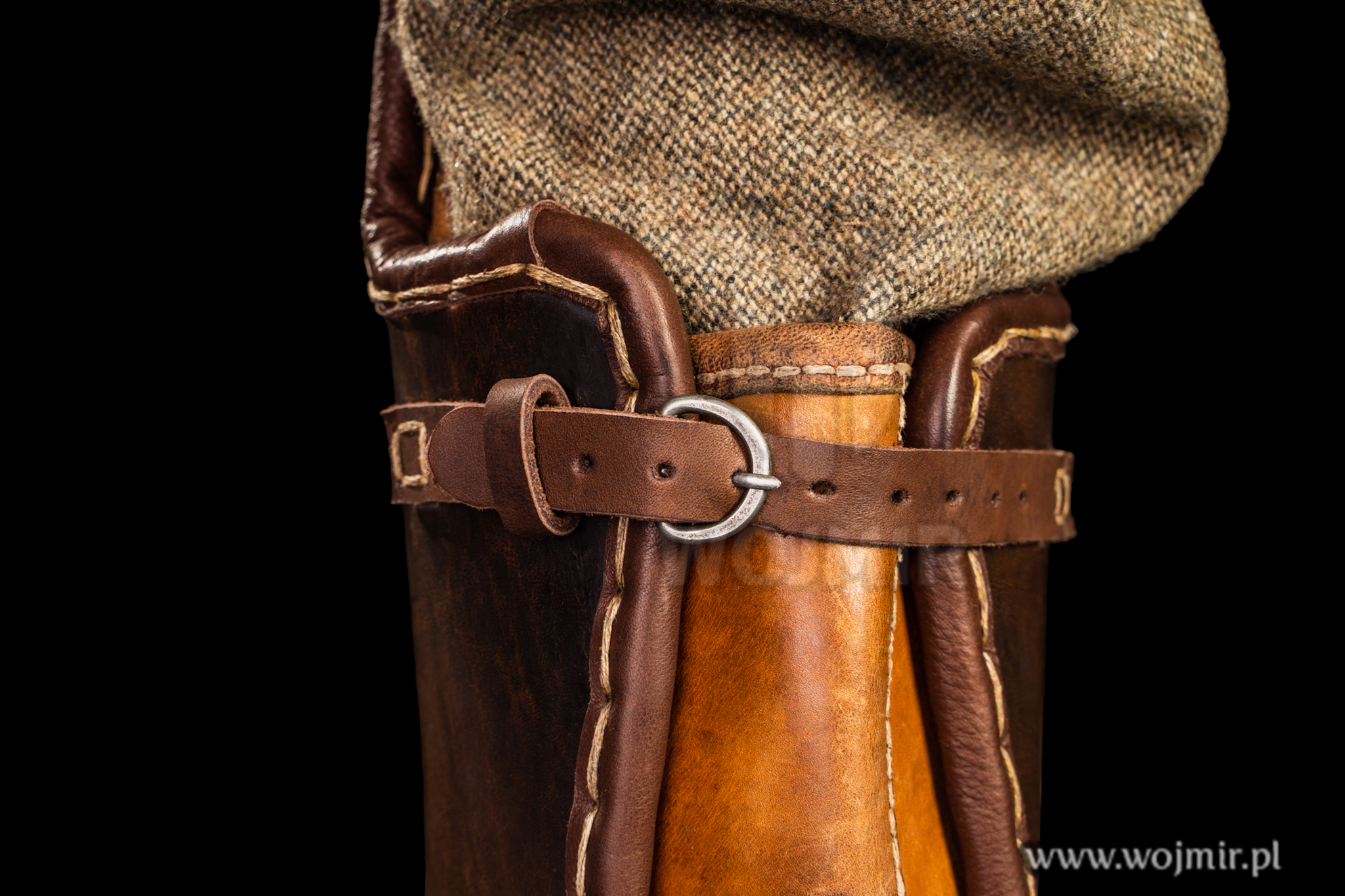 Podana cena za parę. Nagolenniki ręcznie wykonane ze skóry woskowanej o grubości 4,5 mm, zapinane na sprzączki,posiadają skórzane obszycia brzegów oraz wełniana wyściółkę.Wymiary w standardzie: wysokość do kolana 50cm, wysokość pod kolano 30cm, obwód w łydce 38cm, obwód w kostce 26cm