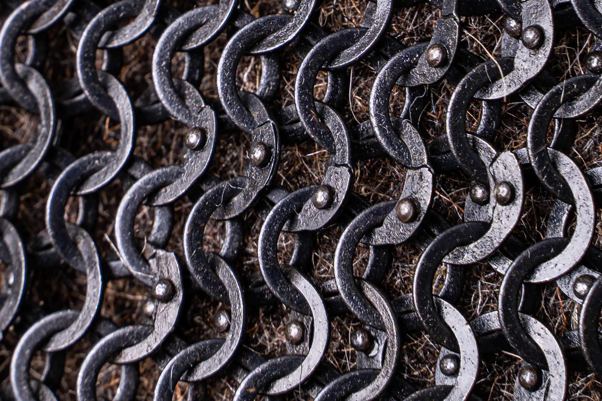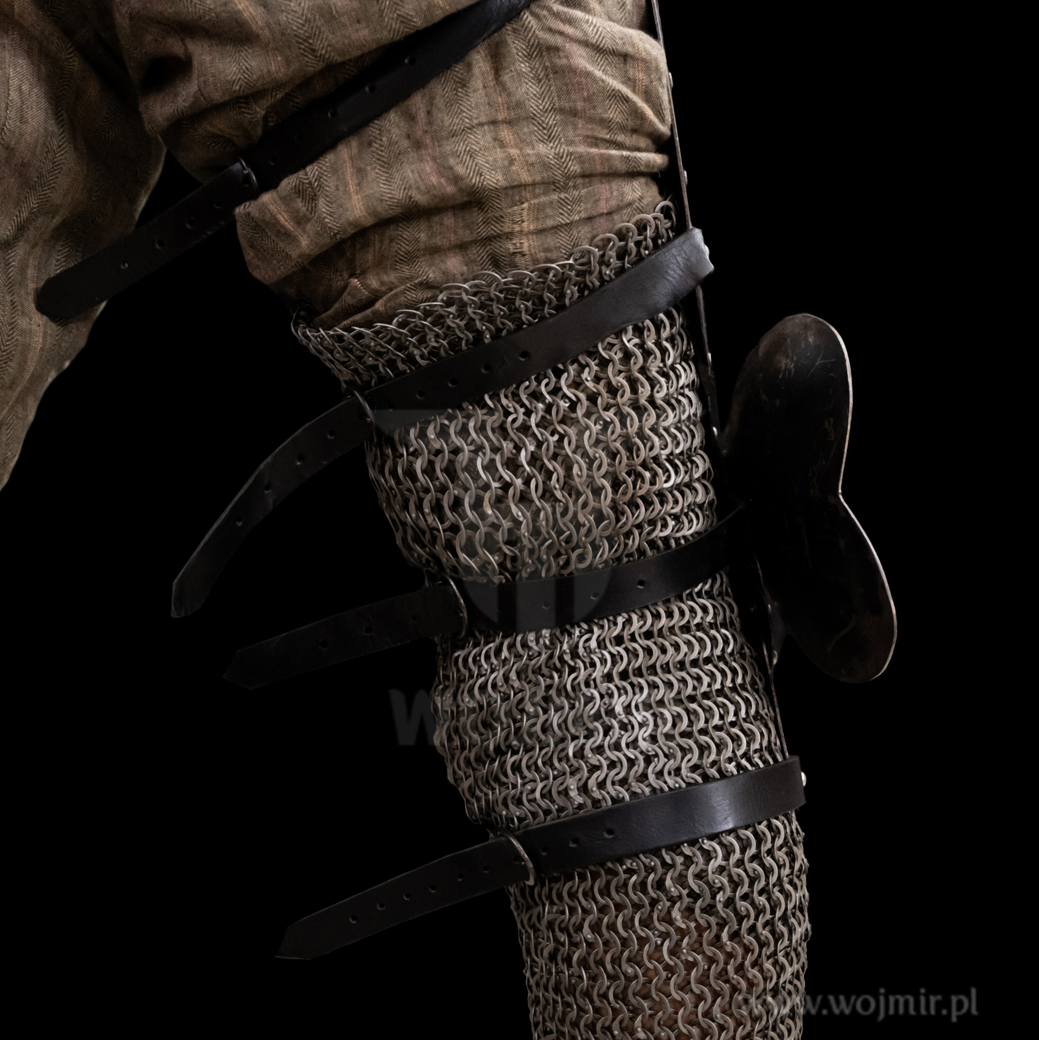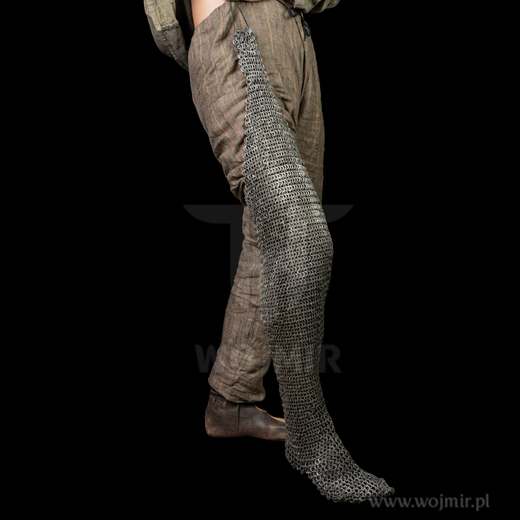 Nogawice kolcze wykonane z kółek 9mm płaskich na nit okrągły, nitowane naprzemiennie z kółkami sztancowanymi. Pasują na obwód łydki do 42cm i obwód uda do 55cm.