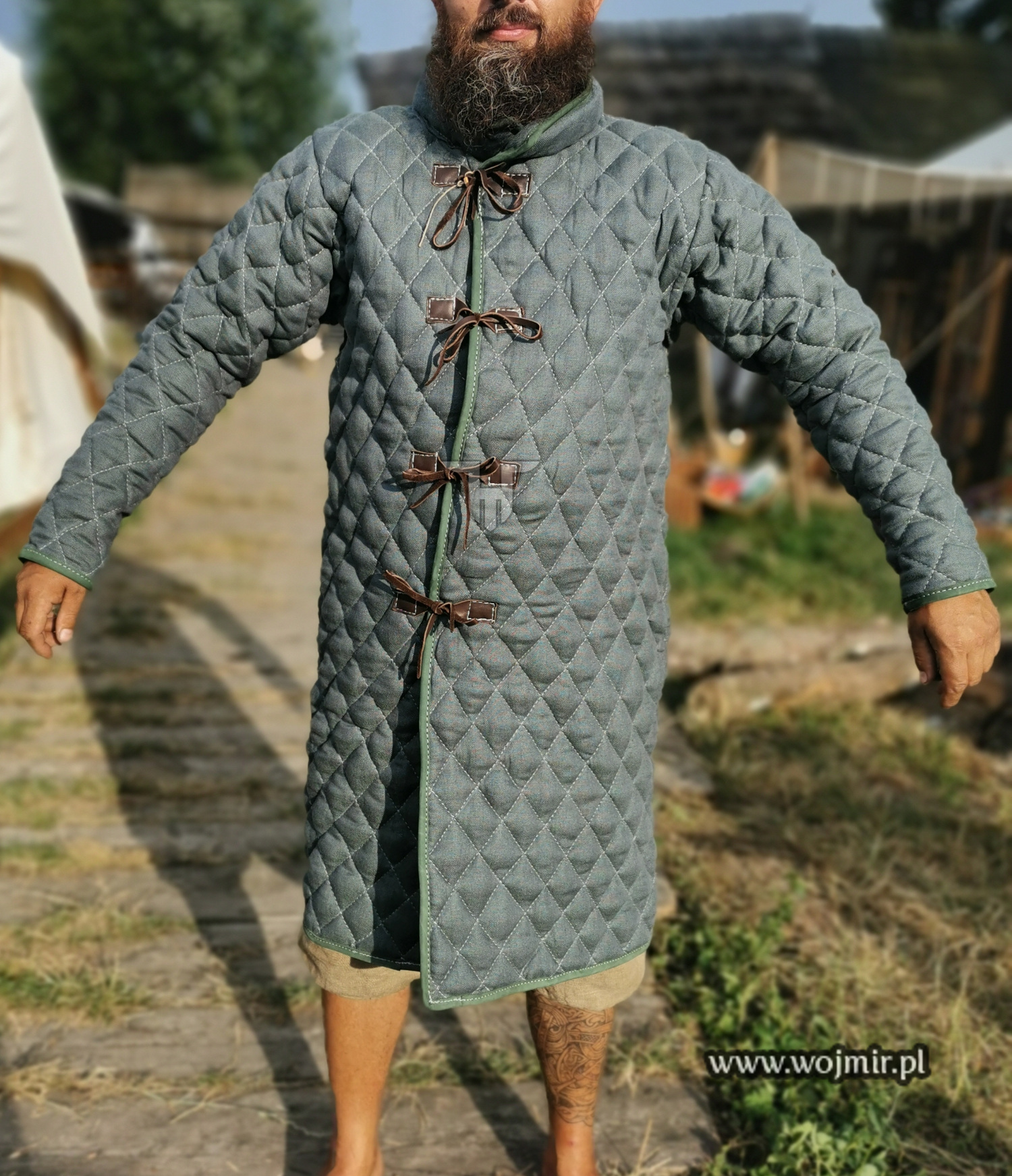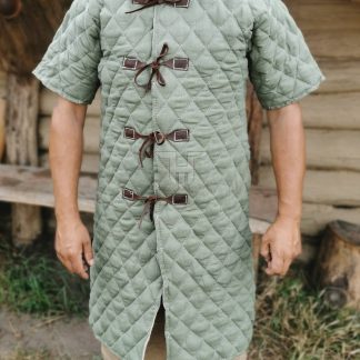 Wykonana z grubego naturalnego lnu 100%. Gramatura materiału 230-350g/m2. Grubość wypełnienia dedykowana do walk rekonstrukcyjnych. Podszewka również z naturalnego lnu. Przeszywanica posiada skórzane obszycia brzegów i w całości jest szyta mocną nicią.